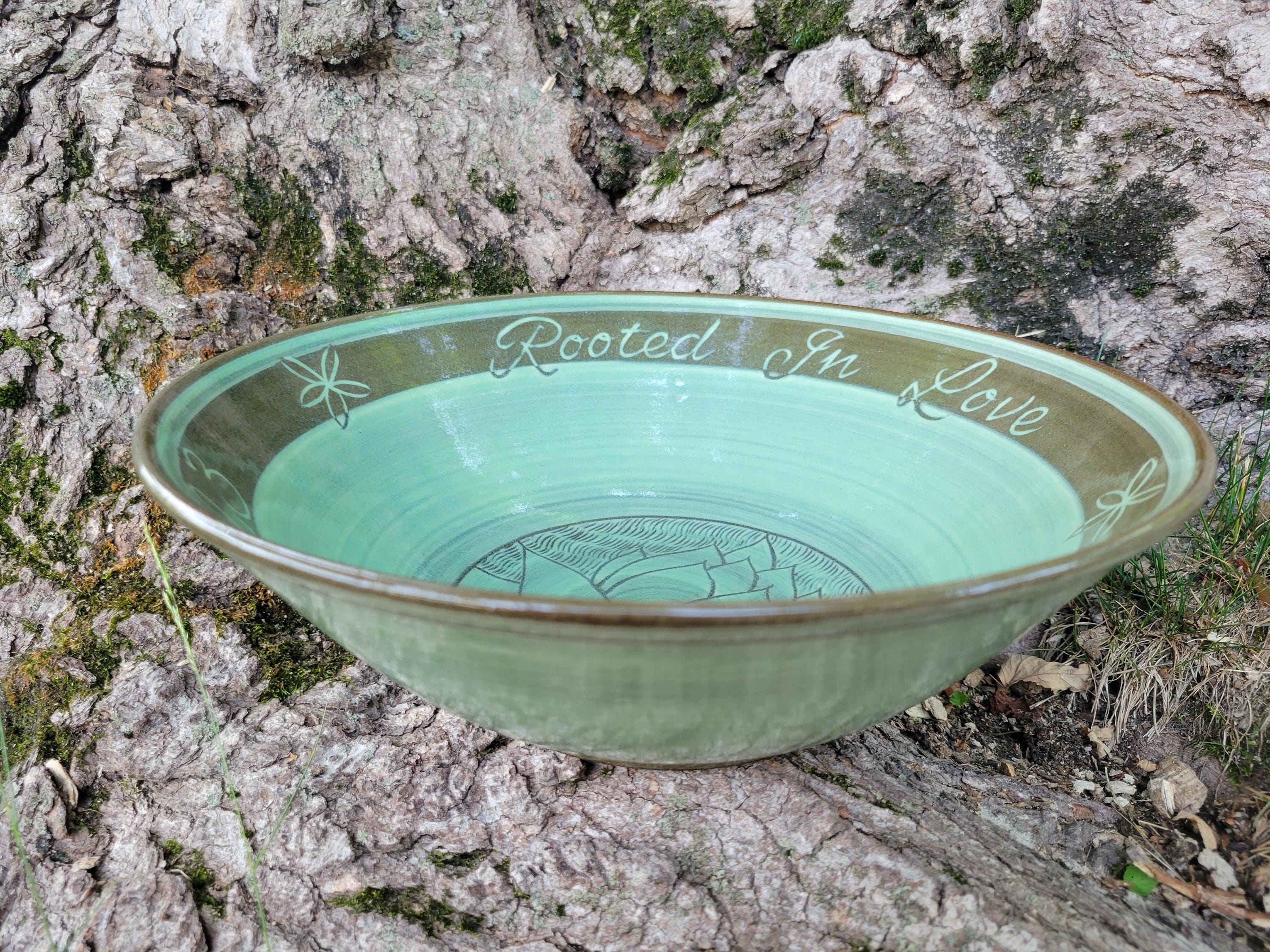 Celebrate and honor newlyweds or anniversary couples with my beautifully handcrafted, personalized large serving bowl, featuring an intricately carved lotus design in a soft Celadon Green glaze. This unique piece is engraved with "Rooted In Love" and significant dates, making it a truly memorable wedding or anniversary gift.
